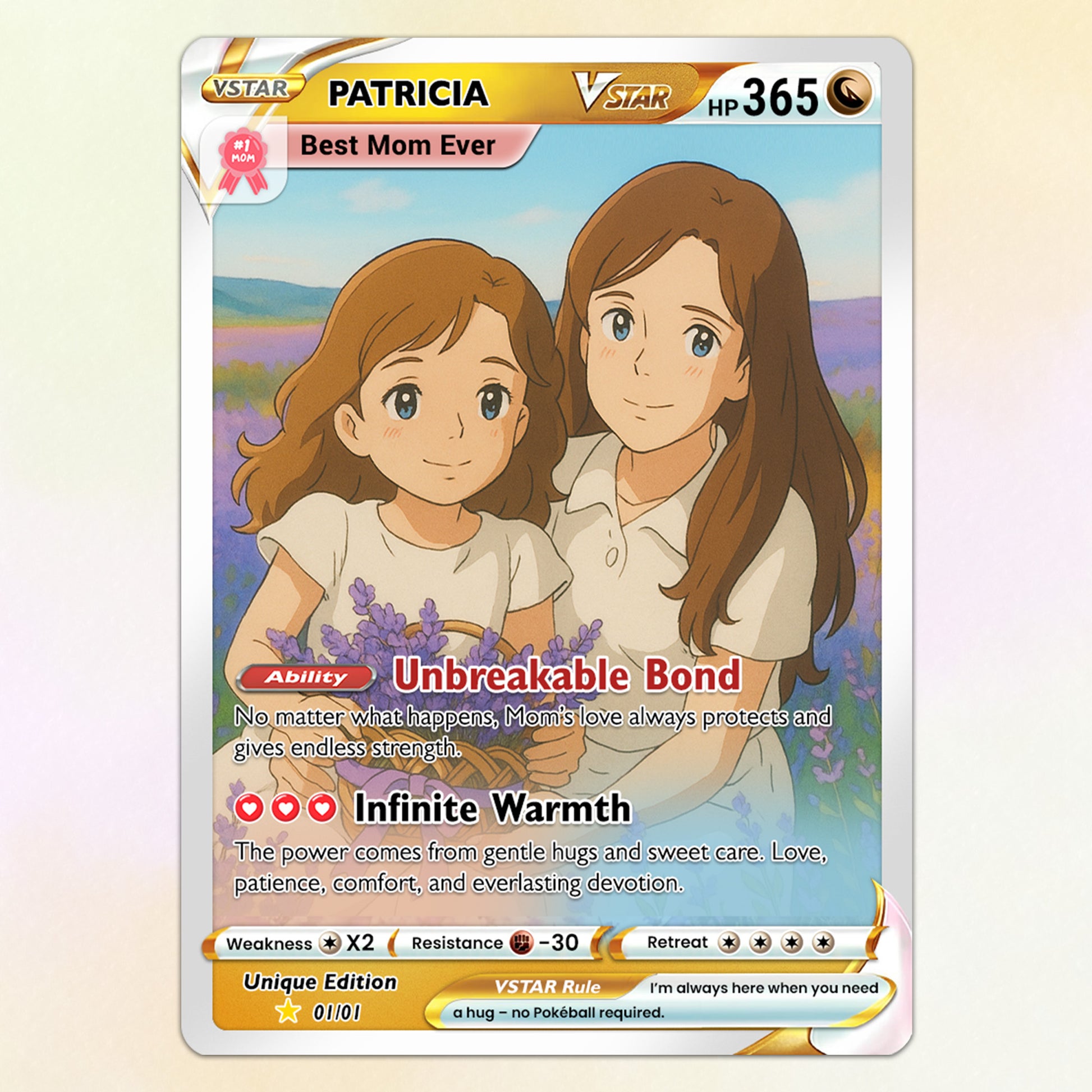 Featuring nostalgic design elements and warm, classic aesthetics, our pokemon card custom brings back the magic of childhood while honoring the unwavering bond between a mother and child. Just like the trusted connection between a Poke Trainer and their companion, this pokemon custom card symbolizes a relationship that’s unbreakable, enduring, and legendary. It’s more than a card – it’s a symbol of devotion, strength, and timeless love.