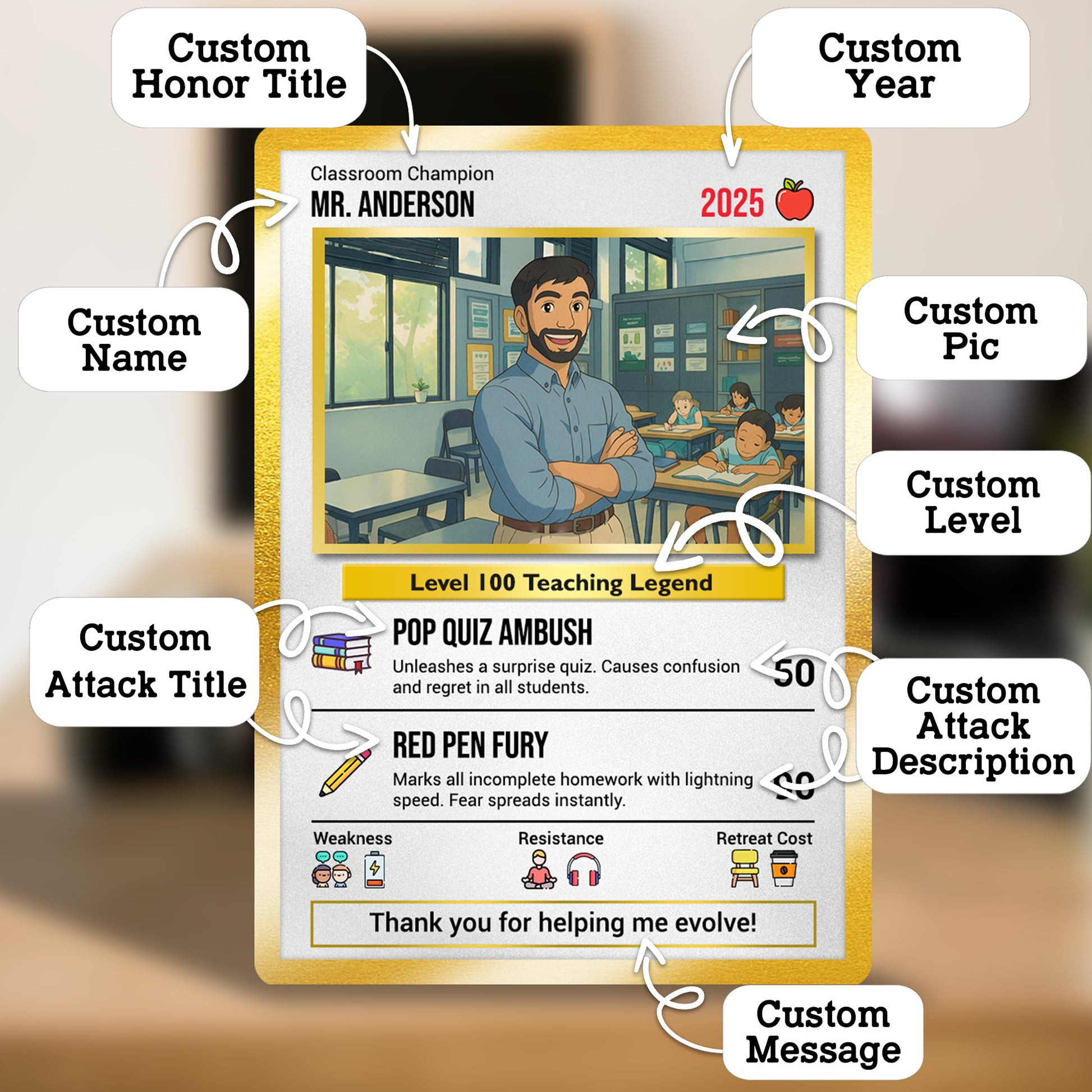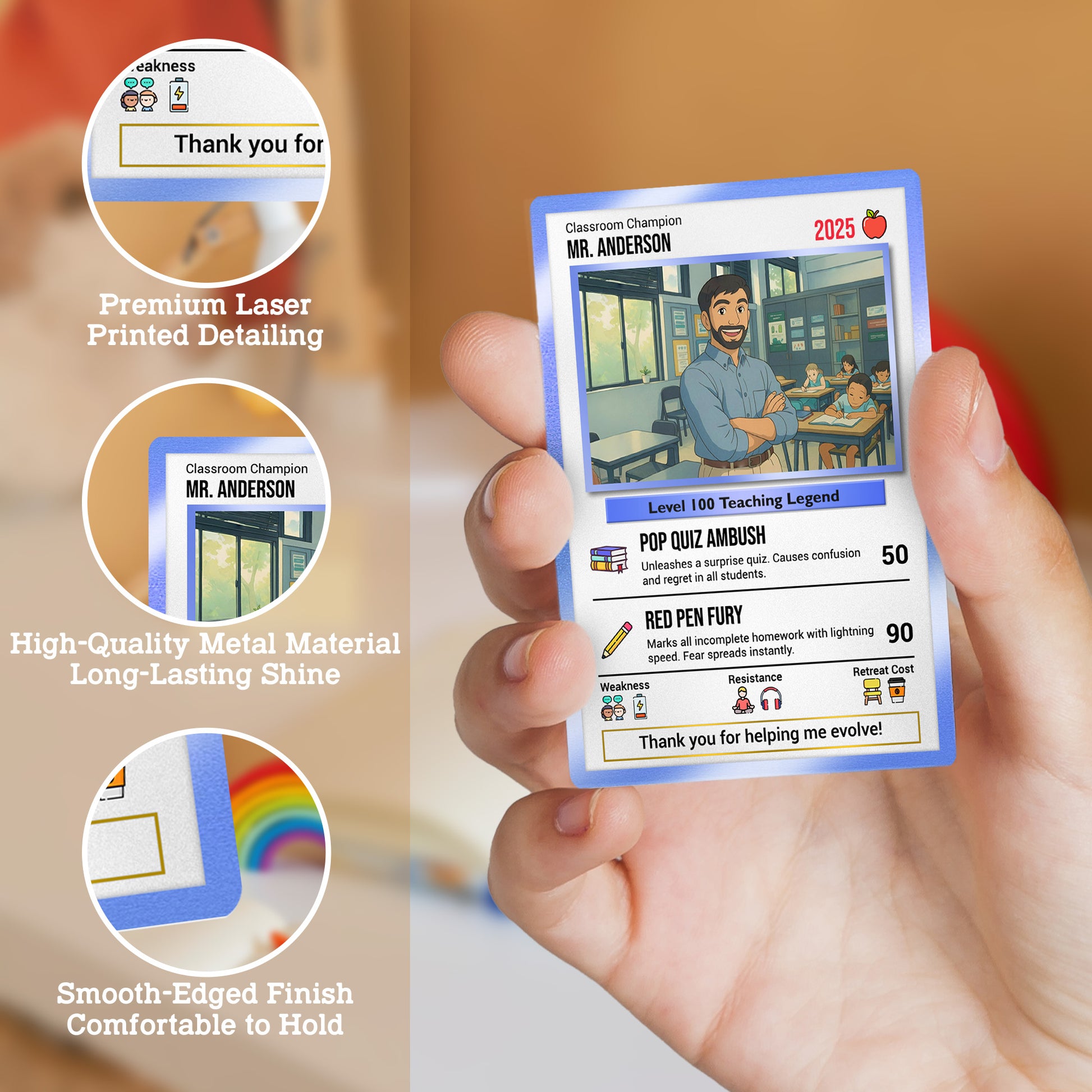 Personalized Poke Card for Teacher Appreciation – Express your gratitude with a unique metal card designed in Pokémon-inspired style. Perfect for end-of-year or Teacher’s Day gifts.