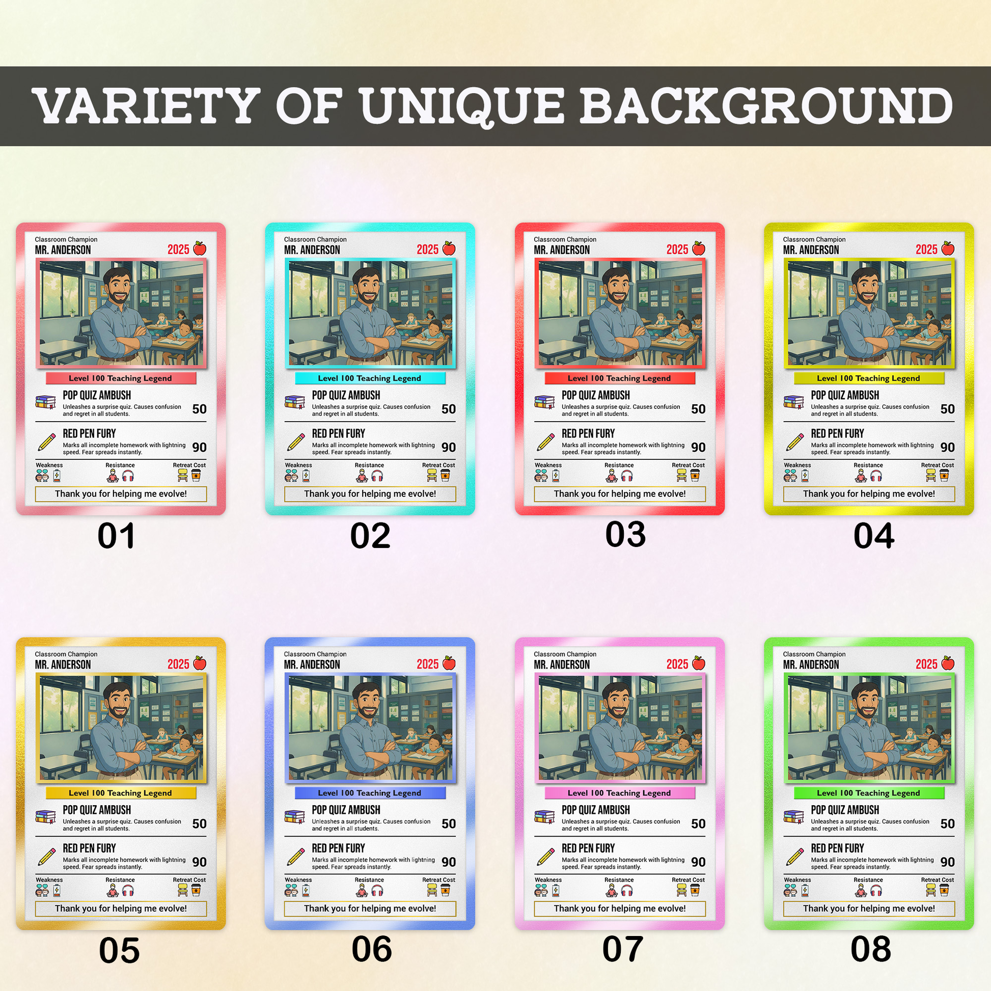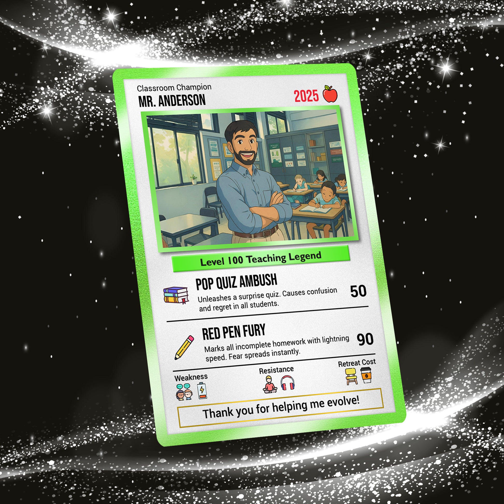 Customize every detail: name, title, background, and even their “special powers.” Maybe your teacher uses “Homework Beam” or “Infinite Patience”?
