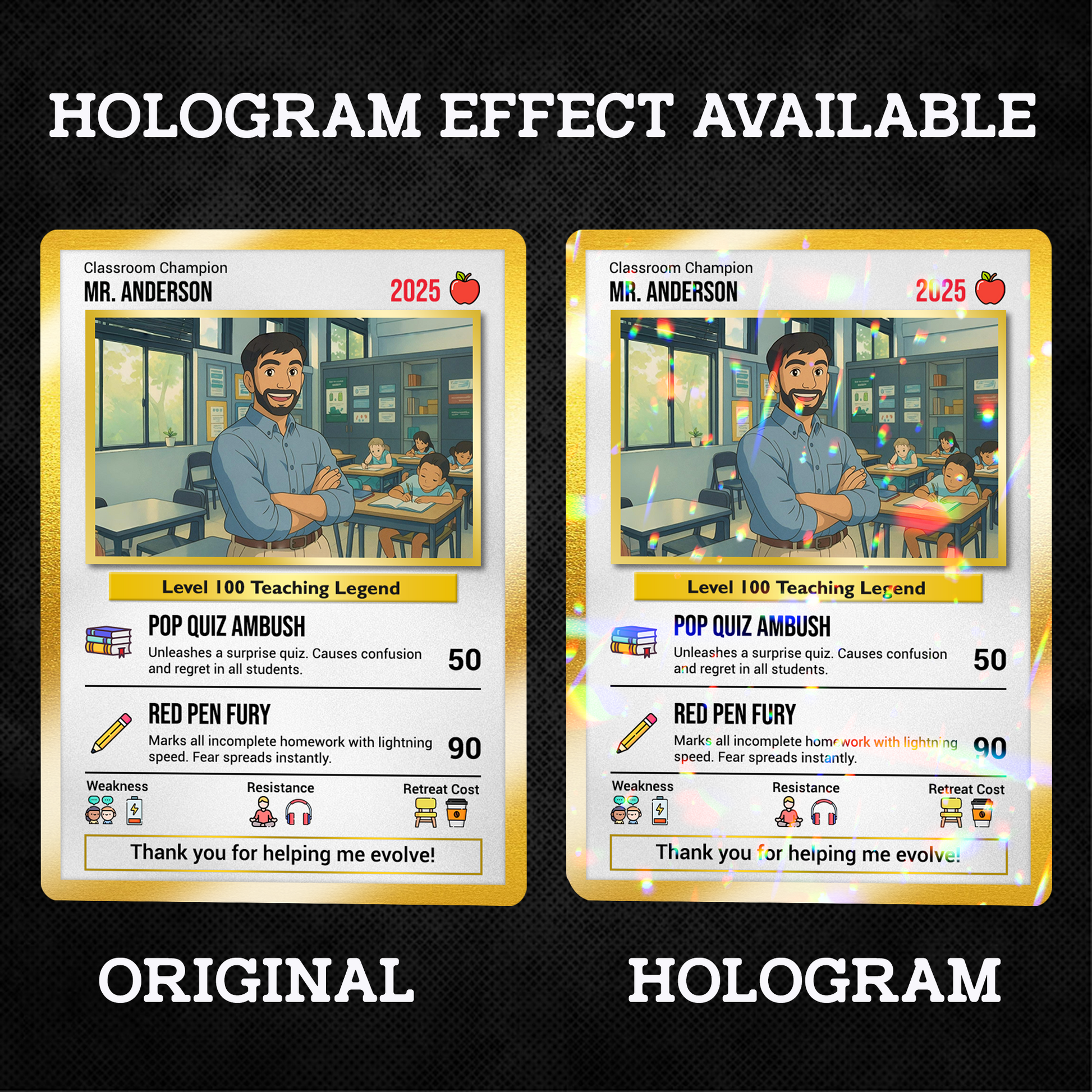 Honor the teacher who made a difference with a custom-made metal Pokemon-style card that brings fun, creativity, and heartfelt appreciation together in one unforgettable gift. Whether it's the end of the school year, Teacher's Day, or just a spontaneous thank-you, this Personalized Pokemon Card is a standout way to say “You’re Legendary.”