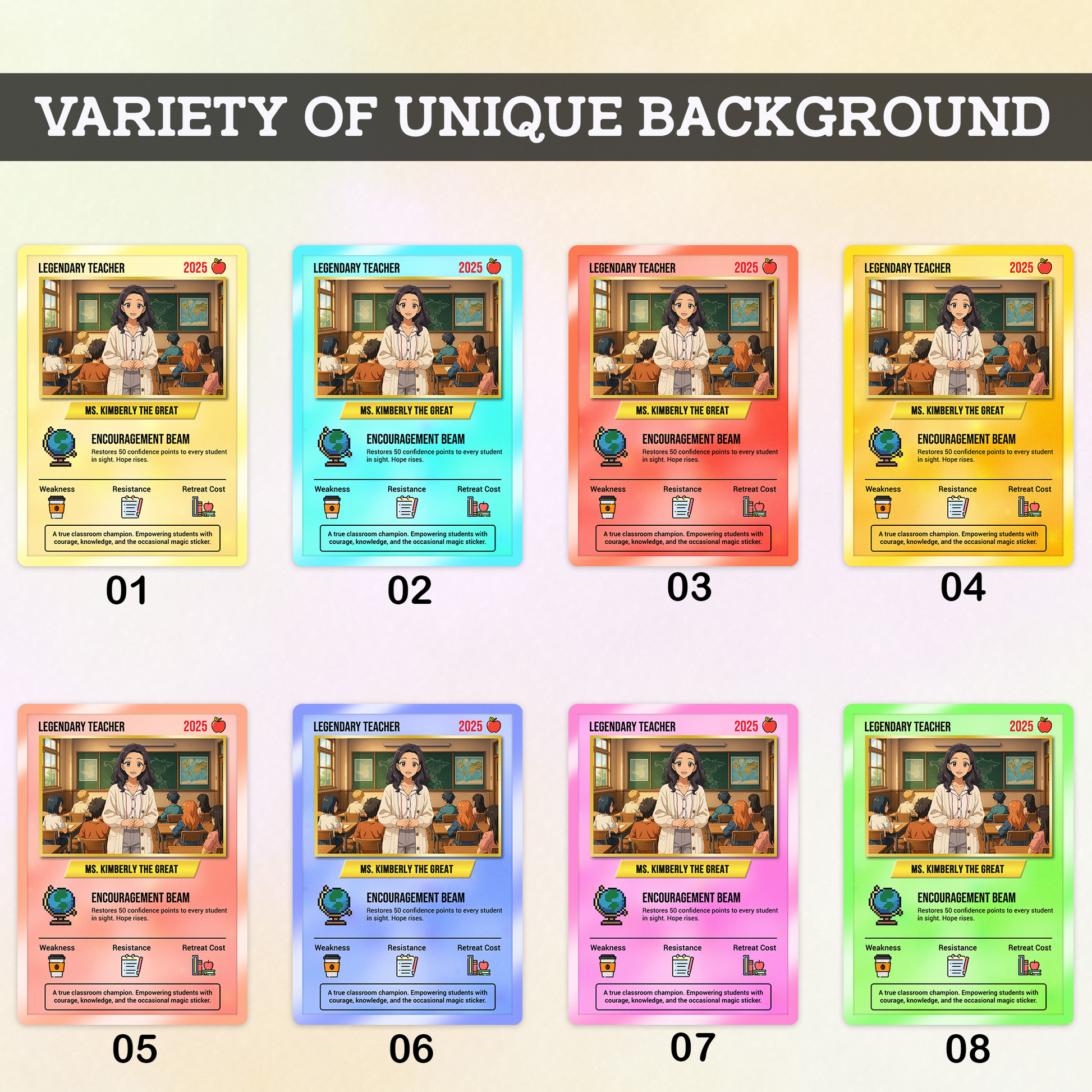 Customize every detail: name, title, background, and even their “special powers.” Maybe your teacher uses “Homework Beam” or “Infinite Patience”?