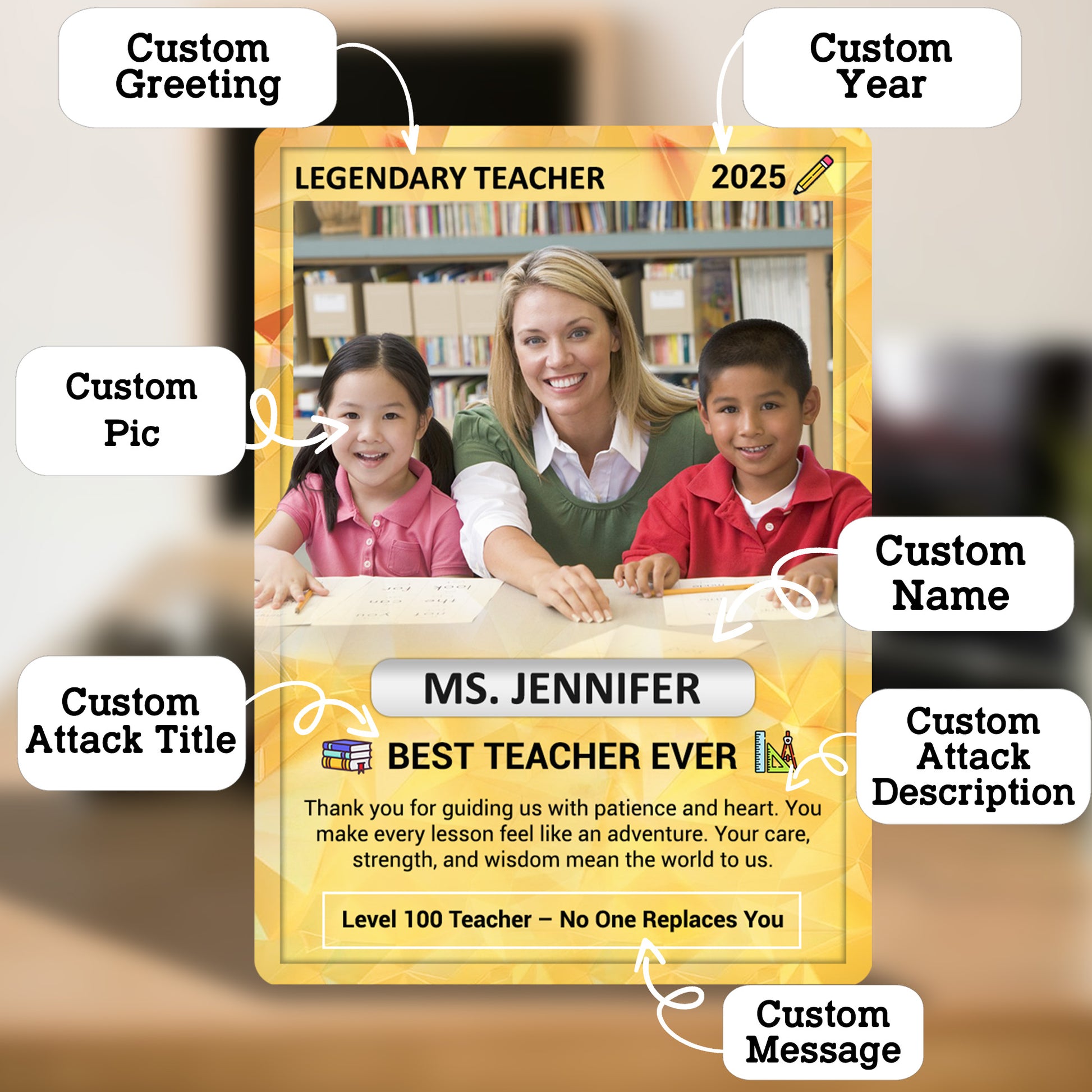 Honor the teacher who made a difference with a custom-made metal Pokemon-style card that brings fun, creativity, and heartfelt appreciation together in one unforgettable gift. Whether it's the end of the school year, Teacher's Day, or just a spontaneous thank-you, this Personalized Pokemon Card is a standout way to say “You’re Legendary.”